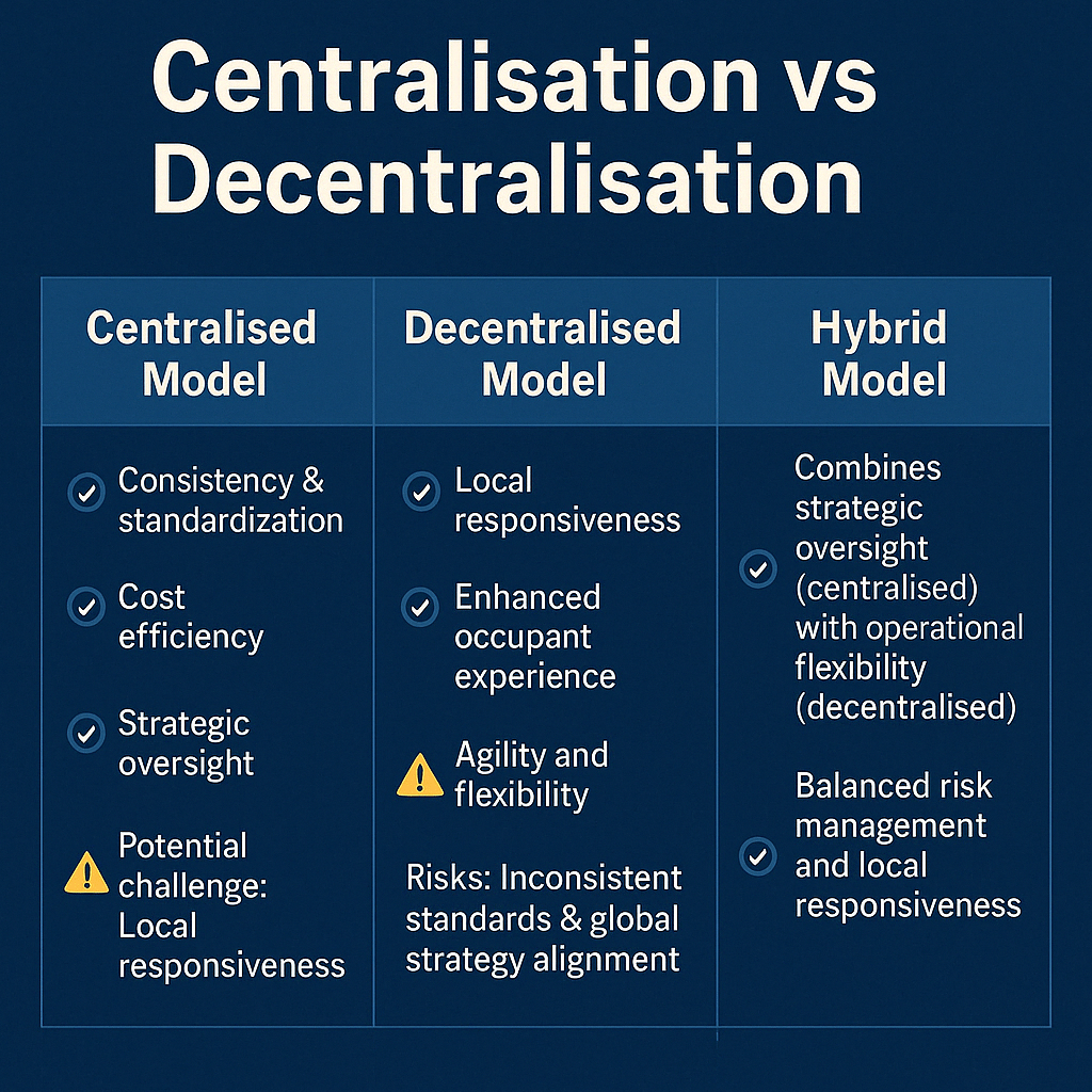 In my experience of leading large-scale property portfolio transformations, I’ve worked with both centralised and decentralised models. A key insight is that driving a globally consistent model—especially if consistency is a strategic objective—is typically more successful through a centralised approach. However, local bases can also work effectively when appropriately supported.